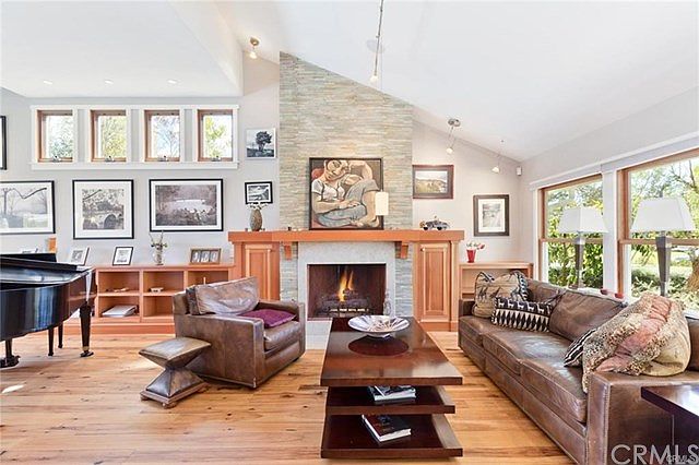 Welcome home to tropical paradise, set on a flat 10,000+ sqft lot with picturesque panoramic views of the Saddleback Mountains. Tucked away behind gates on a DOUBLE CUL DE SAC, this rare home is situated in the coveted Top of the World community. This midcentry modern masterpiece was taken down to the studs and rebuilt with the finest finishes in 2013. Upon entrance, you are greeted with a light and bright room anchored by one of two wood burning fireplaces and reclaimed hickory wood floors. The soaring high ceiling living room features huge Sierra Pacific windows allowing you to enjoy the mountain views from the comfort of your home. The immaculate chef kitchen includes custom cabintery, granite counters, a warming drawer, top of the end appliances including a sixty inch La Cornue gas range. Enjoy the perfect storing conditions in your 800 bottle temperature controlled wine cellar. Off of the kitchen is an oversized pantry with an extra oven, truly a cooks dream. The backyard opens up to the spectacular view, the mosaic covered BBQ and tranquil pool and spa make for great outdoor entertaining. The spacious master suite is an oasis with vaulted ceilings and wide mountain views, the bath is lined with walnut tile and marble finishes, an incredible Japanese soaking tub and a huge shower. This gorgeous home is filled with refined luxury, texture and details throughout. This truly special home and lot is a families dream come true.