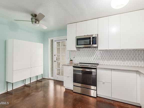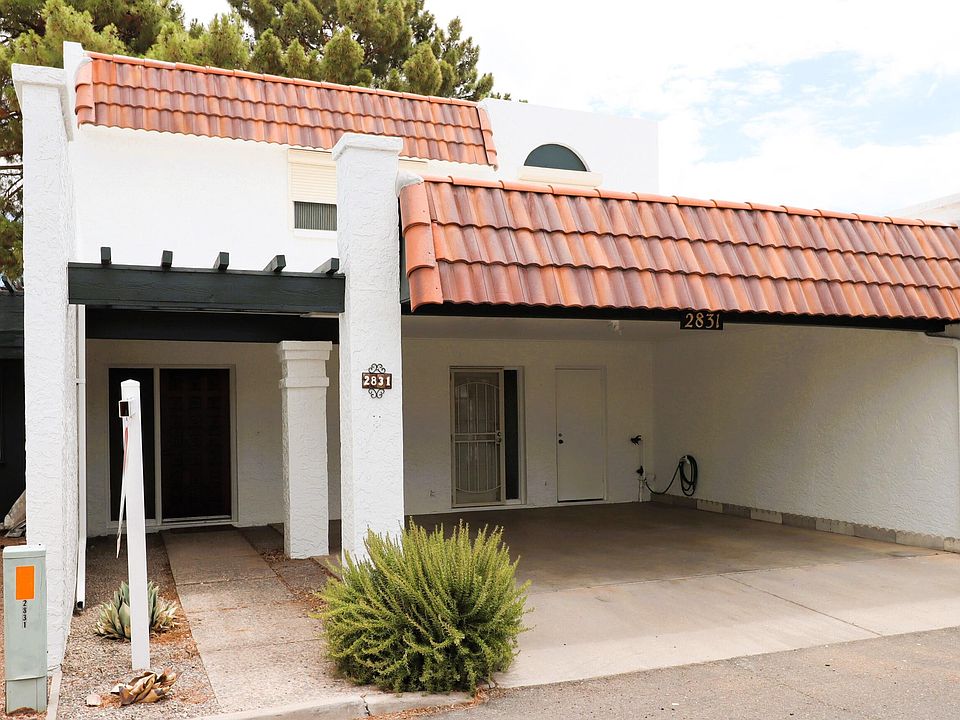 WELCOME HOME! Centrally located just outside of ARCADIA, this two-story townhouse is tucked back in a quiet, private GATED community with a reasonable HOA fee! Pull into your own 2 car carport with an extra storage room attached. Inside, you'll find a beautifully REMODELED kitchen, vaulted ceilings, NEW CARPET, concrete floors, and sliding glass doors out to a cozy back patio. The eat-in kitchen provides stainless steel appliances, tile backsplash, and plenty of white cabinetry. MAIN FLOOR PRIMARY bedroom has a walk-in closet, ensuite bathroom with dual sinks, and outdoor access! Upstairs you'll find 2 carpeted bedrooms, each with two closets. Larger secondary bedroom boasts electronic sun shades to help keep the upstairs cooler in summer at the touch of a button! The 2 bedrooms upstairs are separated by a full bath. Enjoy the largest floor plan in the community with over 1,650 sq feet! Exterior of units just PAINTED by HOA! Swim in the hot summers in the community POOL. This home has so much to offer