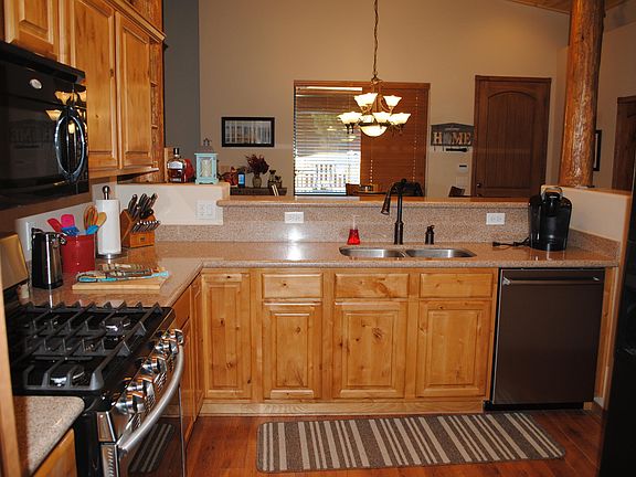 Beautiful Bison Villa. This 3 bedroom, 2 bath split floor plan has 1550 sq. ft. Sit on the first hole of Bison Golf Course with a covered deck. This upgraded home has a new gas stove and black appliances and gas fireplace with custom floor to ceiling rock, solid surface kitchen counters and natural gas to the covered deck for grilling. Come see this beautiful and maintenance free home today