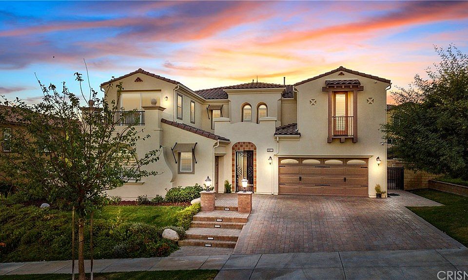 This exquisite Mediterranean 5 bedroom + office/additional downstairs suite home is located in the exclusive gated community of West Hills. The home has a luxurious feeling a great sense of space, w/ high ceilings, spiral staircase and opening up into a great open plan living area. The kitchen has dark cabinets w/raised panel doors, a large island with barstool space, designer glass subway tile backsplash and sophisticated GE Monogram appliances add to the luxurious feeling. The family room is open to the kitchen with a centrally focused fireplace. The family room has a bonus space that can be utilized as a seating area away from the TV. The downstairs office with built in cabinets can be accessed from sliding glass doors to the front of the home or can be utilized as a bedroom with it's own on suite bathroom. The single garage has been converted into a home gym. Private pool & spa as well as being able to use the community pools. Enjoy the stone patio and balconies for outdoor entertaining. Side yard for kids and pets which enjoys some fruit trees. West Hills Valencia offers residents paseos, pool/spa, clubhouse, expansive parks & Gold Ribbon award-winning schools.