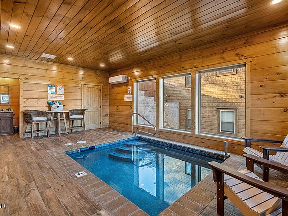 The main-level master suite provides comfort and convenience, while upstairs you'll find two additional bedrooms, each with its own private bathroom. The lower level offers a spacious game room and additional lounge area, leading to one of the property's standout features—your private indoor inground pool, perfect for year-round enjoyment.