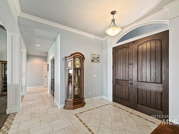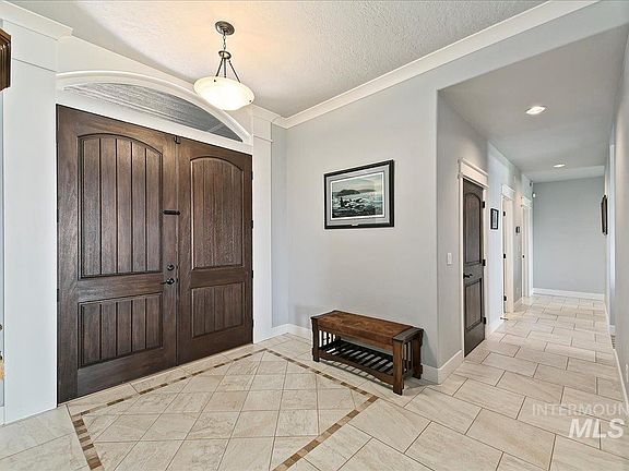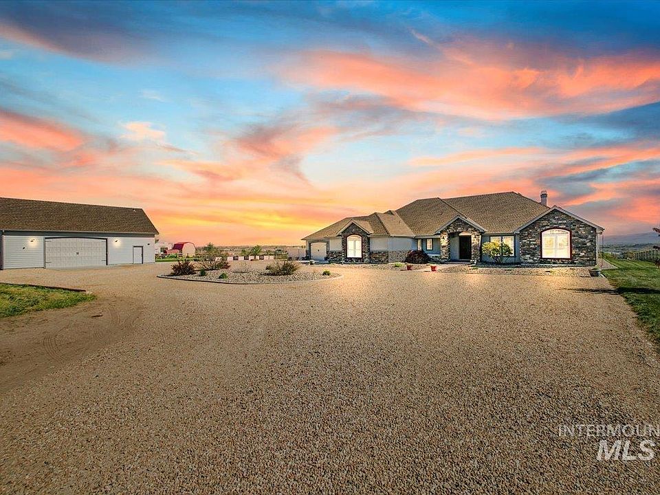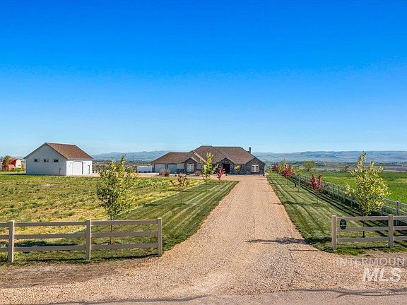 Live your country dream in this custom-built single-level home with mesmerizing views of the Snake River and Owyhee Mountains. An abundance of windows create a light and bright main living area enhancing the 16ft vaulted exposed beam ceiling. The kitchen is a true focal point featuring Alder cabinets, a granite island, Dolomitic marble back counters, custom patina tiles, Bertazzoni professional series gas stainless steel range, convection speed oven & single wall oven. This home has been designed with privacy & accessibility in mind featuring wide hallways & doors, split-bedroom floor plan, office & sunroom. The primary suite bathroom is complete with heated tile floor, dual vanities, walk in shower & jetted tub. Spacious guest bedrooms share a Jack & Jill bathroom. On your way to the shop, check on your garden & swing through the orchard to grab a snack right off the trees. Insulated & heated 30’ x 40’ shop with 220, a loft for storage & a hobby room with a water closet & utility sink.