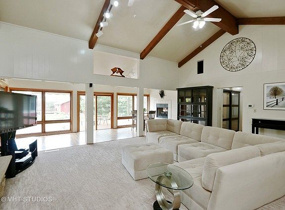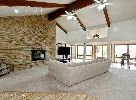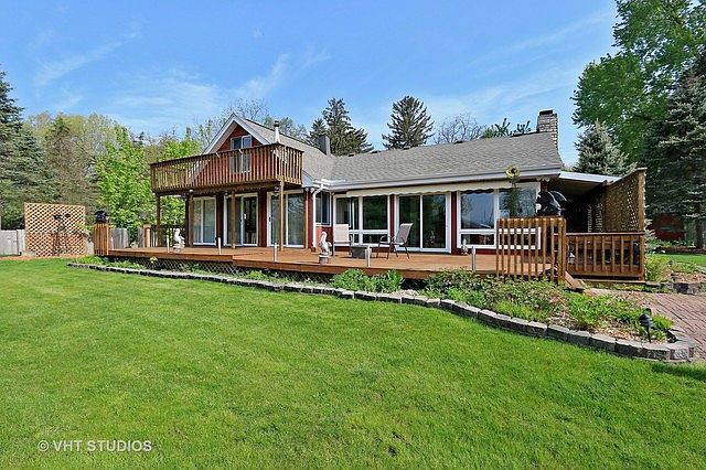 Check this one out! Gorgeous Chain O Lakes waterfront*Double lot on a wide channel between Dunn's and Nippersink Lakes*Land across the channel is unbuildable state owned=No neighbors behind you*No road traffic-Street dead ends*Huge open Great Room with wall of glass and access to beautiful views of sunrises, sunsets, perennial gardens and nature*3 Fireplaces with gas logs and one is multi sided to the 1st floor Master*Whirlpool*Wet bar has amazing cabinet storage*Under cabinet lighting*Open concept kitchen is great for entertaining and sliders to private deck*Upper level bedroom has lots of extra storage and access to exterior balcony*Multi level decks with automated awning attached to the home*Gas fire pit (Can be removed and deck area covered)*Multi level decks also at waterfront by the boat house*Fully fenced yard and sensor lighting*Multiple garages for all your toys and large shed attached to the side of 2 car garage for even more storage*