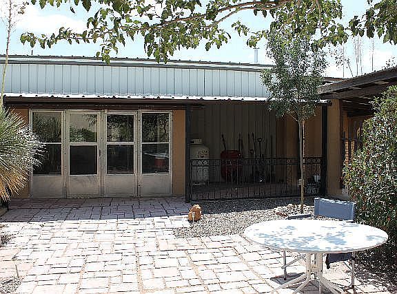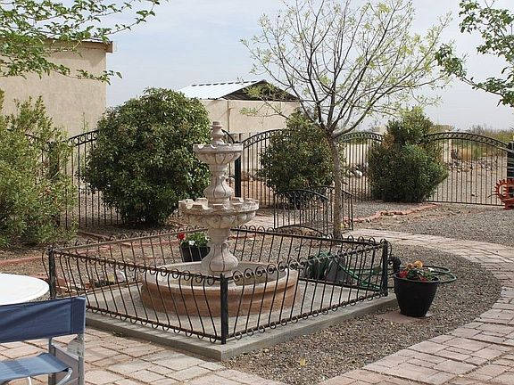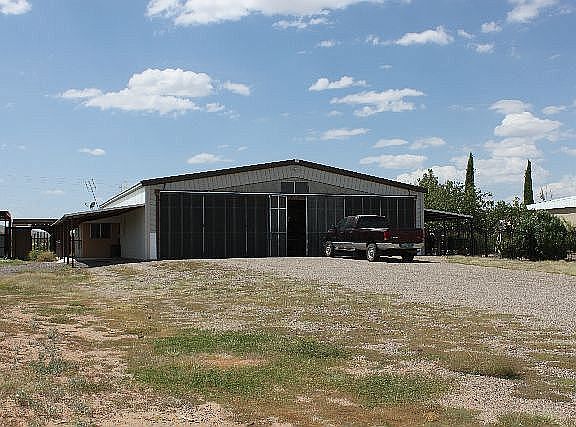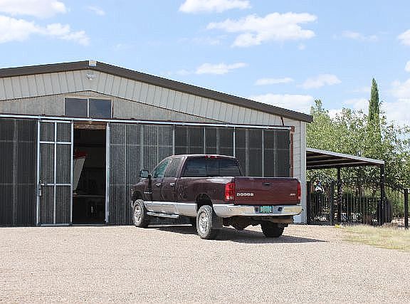 2 parcels one with hangar/home for airplane and/or hobby storage/construction The other parcel (2.6 ac) used for horses. Has tack room and covered storage for vehicles and trailers. Has a well for watering animals. The hangar has lighting, parking lot brightness. 220 volt for air compressor, 220 volt connection for welding. 220 volt connection for an RV hook up, water and black water connections. Hangar has office and wash tubs. Refrigerator for all you refreshment cooling in hangar/workshop. Hangar workshop is 50 ft x 30 ft. with Horton stack door. Runway is 4800’ x 30’ hard surface. Taxi way is also hard surface. Main parcel has newer well in gorgeous courtyard fenced in 6’ wrought iron with fountain and irrigation. Home has 3 bedrms, 2 baths, den, dining rm, large kitchen (gas and wood cooking), spacious great room w/entertainment center. Gas and electric heat, evaporative and electric cooling. All appliances remain. Turnkey optional. Hot water heater, washer dryer, NEW! 120 gal propane tank is owned. Ante room to master bedrm for hot tub or fitness equip. Ante room to kitchen leading to courtyard for staging gardening.