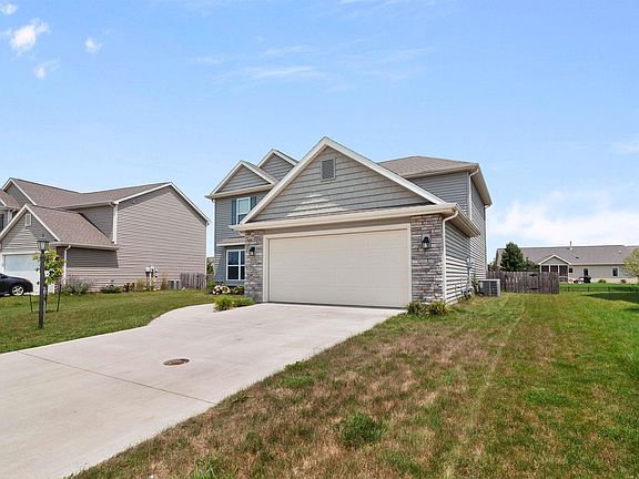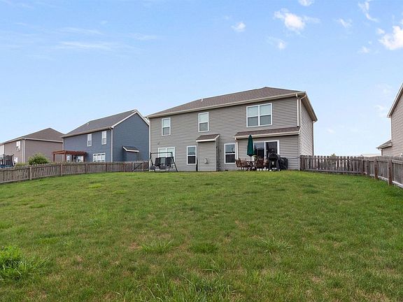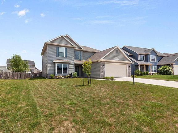 Built by Heller Homes in 2016, this stunning 2380 SF residence offers 4 bedrooms and 3 full baths over two well-planned levels. The stone and vinyl facade is both attractive and durable, and the expansive lot is ideal for kids, pets, and entertaining. The main level features a 2-story foyer with hickory wood floors that opens to a formal den and a large great room with a direct vent fireplace and large windows. The great room seamlessly transitions to a nook and a chef’s dream kitchen with custom Grabill cabinets, abundant storage, a 5-foot island, and a walk-in pantry. Also on the main level is a versatile bedroom, perfect for a guest suite, office, or game room, along with a full bath and a spacious laundry room situated between the finished 2-car garage and the bedroom. The second story houses 3 additional spacious bedrooms and a second full bath, including a huge master suite with a private ensuite featuring a twin vanity, a 5-foot shower, an enclosed toilet area, and an 8’x13’ walk-in closet. All appliances stay with the home.