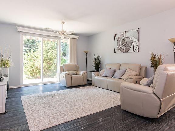 Gorgeous Winthrop model with PREMIUM BERM LOT! This home has an Eat-in Kitchen with large pantry. Kitchen has new 42 white soft close cabinets, don't miss that the cabinet bottoms, granite counters and back splash. New stainless steel appliances, check out the 3rd shelf in the dishwasher. New waterproof vinyl flooring in Living, dinning room area along with kitchen and hallways. Freshly painted in Grey hues for that home sweet home feeling. Master bedroom has the window bump out for extra sitting area. Large concrete patio overlooking the large grassy private yard. No homes behind! Edgewater by Del Webb is a Lifestyle over 55+ community. One person living in the house needs to be 55+.Edgewater takes care of grass and snow, is a 24/7 gated community, has a beautiful Creekside Lodge with an indoor pool and hot tub and outdoor pool, tennis courts and bocce courts.