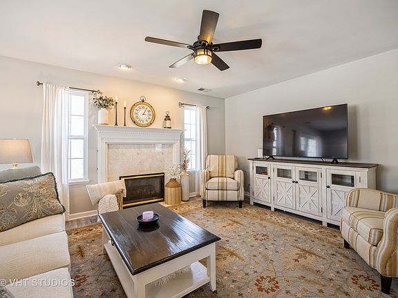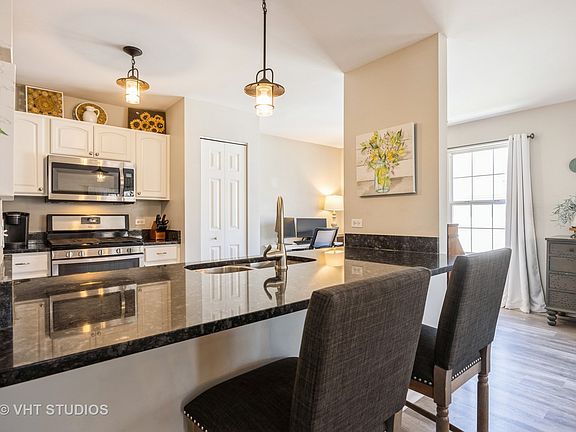 Discover the charm of this stunning three-bedroom, two-bath upper-level ranch townhome in the serene Cobblestone Woods community. Spanning 1,784 square feet of thoughtfully designed single-level living, this home boasts an open-concept layout that creates a bright and airy ambiance. Highlights include a modern breakfast bar, a spacious dining area, and a cozy fireplace that adds warmth and character. Luxury vinyl plank flooring flows seamlessly throughout, complementing the contemporary design. The expansive master suite is a true retreat, featuring a relaxing sitting area, dual walk-in closets, and a private full en suite bathroom. Step outside to the secluded balcony, where you can unwind while overlooking a picturesque wooded landscape. Nestled in a peaceful neighborhood, this home offers the perfect blend of tranquility and convenience~close to scenic bike trails, tree-lined streets, and just minutes from shopping, dining, and the train station. This is low-maintenance living at its finest!