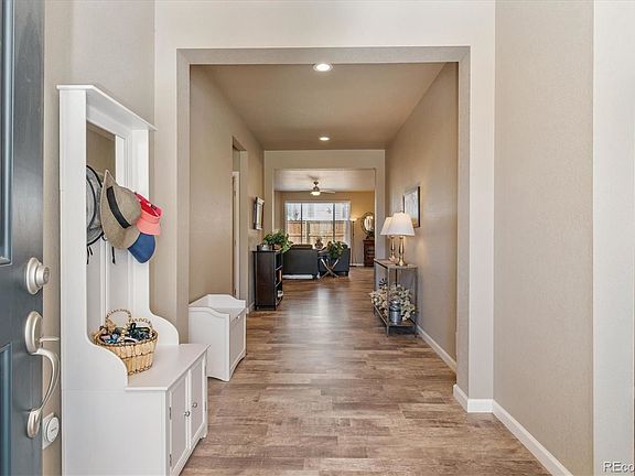 This home has over $40,000 in builder upgrades and options!! Meticulously maintained and welcoming move in ready ranch home in Prairie Star, Berthoud, CO. Home features an open floorplan with 3 bedrooms and 2 bathrooms all on one level. Interior finishes include a kitchen with granite countertops, Stainless steel appliances including a refrigerator with ice and water in the door. Kitchen island features seating with a large single bowl stainless steel sink. Kitchen is upgraded with soft close cabinet doors, soft close dove tail drawers, and under cabinet lighting. Living area features a gas fireplace, ceiling fan, 9' ceilings, and a large window to the back yard. The Entire home is finished with durable LVP flooring except the bathrooms and laundry room. There is a Reme Halo whole house air purifier installed in the furnace. Primary bedroom has a tray ceiling with a ceiling fan. There is a spacious 11 1/2 X 5 walk in closet for all of your clothes and accessories. Both bathrooms have upgraded features with Granite countertops, tile floors, and tile surrounds in the bath and shower. The front yard is landscaped with sod, shrubs, a tree, and a sprinkler system. The 8'sliding glass door from the dining area leads outside to a 12 X 12 covered concrete patio. The rear yard is a low maintenance xeri-scape with flowers, shrubs, and a green turf area for pets.