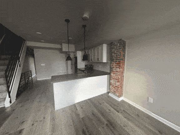 This 730 sq. ft. urban residence in Philadelphia offers a harmonious blend of historic charm and modern design. Spread across two floors, the space showcases exposed brick walls that add character and warmth to the contemporary interior. The ground floor, measuring 450 sq. ft., houses an open-concept living area and kitchen. The kitchen features sleek white cabinetry, stainless steel appliances, and pendant lighting, creating a stylish and functional cooking space.