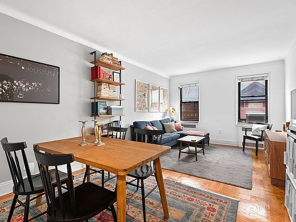 Spacious and modern one bedroom apartment located in a fastidiously maintained elevator co-op in a leafy corner of Midwood right up the block from Brooklyn College. This renovated first-floor apartment is in pristine condition with modernized kitchen and bath, hardwood floors, multiple closets, and it simply has tons of space to live and work. The kitchen is equipped with stainless GE appliances including dishwasher, quartz countertops , and ample cabinetry for all of your storage needs. Adjacent you’ll find a very large living room which can accommodate both a sofa set and a full-size dining area as well. The bathroom is bright, windowed, and has a comfortable layout. The bedroom is truly massive, with windows on two exposures and room for up to a king-sized bed, home office setup *and* additional lounging area — and you get a walk-in-closet too! The adjacent building sits low and at a respectable distance away from the co-op, allowing plenty of light through the windows of each room.