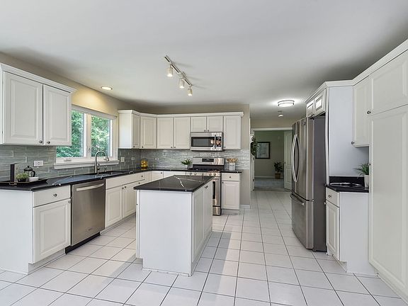 Welcome to your new home! Expansive kitchen with island, abundant cabinetry & stainless steel appliances. Eating area with views of your kitchen & family room with French doors to your picture perfect backyard! Airy & bright family room with custom shelving overlooking your tree filled backyard with patio. Office could be a 5th bedroom if needed on the main level. Primary suite with vaulted ceiling & primary bath with skylight & double sinks! Additional bedrooms with a hall bath featuring double sinks complete the second level. Finished basement with wet bar, second family room & game room. First floor laundry room with cabinetry! 3 car garage with epoxy flooring & storage cabinets! Gorgeous backyard with green space behind it & patio... perfect for entertaining.