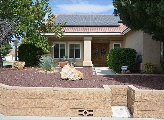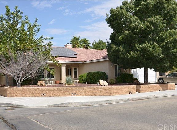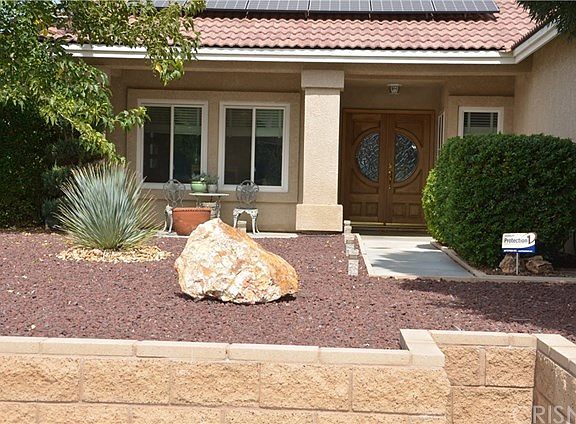Completely upgraded through out and energy efficient. Located near the AV College. Handcrafted custom cabinetry in Kitchen , baths, laundry, linen areas. Wood look tile and newer carpeting. Paid solar!! Newly insulated attic and attic fan, newer AC condenser, newer dual paned windows!! The kitchen is a cook's dream come true! Gorgeous cabinets, quartz counters, walk in pantry, center island, newer top of the line appliances! Master Bedroom retreat has a walk in closet, ensuite with a spa like bathroom- oversized jetted tub, large shower with pebble floor, designer tile and finishes-including the shower door, dual vanities with quartz counters and custom cabinetry. Wow, even the laundry room is a 10+ floor to ceiling custom cabinets, stone counters, sink, built in ironing board, folding area. There is a finished bonus room that was done by the builder for the original owners so the square ft is slightly larger. Could be a 4th bedroom, game room, office? The garage is fully finished with an insulated door, attic storage with ladder and built in cabinets and work bench. Bose speakers in the garage, family room, master bedroom and rear patio. Rear yard has foliage, palm trees and a covered patio with fans.