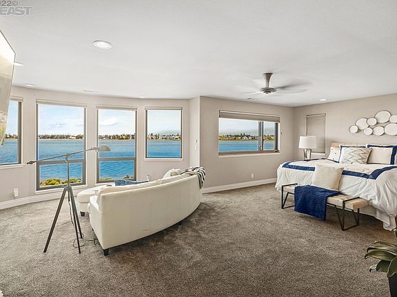 Breathtaking bay and SF skyline views from this exceptional bay front home that has undergone an extensive million-dollar stunning renovation. Elegant and exquisite details adorn this 4,003 sf Harbor Bay home with 5 bedrooms and 4.5 bathrooms. Enter through wide designer French doors to 20+ft vaulted ceilings that enhance this open and airy home. Gorgeous kitchen faces the water features built in wine fridge and a caterer’s station with exterior access. Large bay windows with accordion glass patio doors provide seamless indoor-outdoor living. Primary suite is heavenly with huge bay view windows, and custom closet. Primary bath is expansive with redesigned large shower, spa tub, rounded custom vanity with granite countertop, and separate water closet. Adjacent bedroom also has a bay view. There are 2 additional en suite bedrooms, one upstairs and one on the first floor with independent access. Meticulous landscaping done in the front, side and backyard. Multiple spaces to entertain.