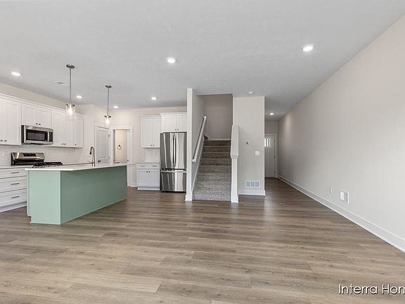 This spacious townhome style condominium features 3 bedrooms, 2.5 bathrooms, and an attached 2-stall garage. The kitchen is complete with quartz countertops, tile backsplash, center island, pantry, and a stylish kitchen appliance package. Enjoy the elegance of laminate floors throughout the main level. A sliding glass door leads from the dining room to the 10 x 10 patio. Additional features include an upper-level laundry room plus a spacious storage room. Located within the Kentwood School district and near many conveniences such as shopping, restaurants and more.