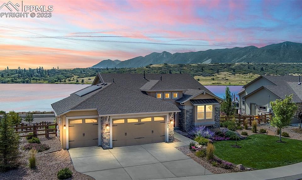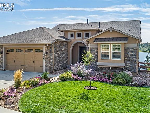 Amazing Forest Lakes home with upgrades throughout and views, views, views! Five bedrooms and five bathrooms, two junior master suites! This home truly feels like you are living in a luxury resort! The ranch floor plan built by Classic Homes sits at the end of a quiet cul-de-sac and leans out over one of two lakes in the area! Walk in to a customized ship lap entry, views of the city, the mountains and the water! Front row seats for the AFA graduation air show! From the fabulous gardens and putting green in the back yard to the covered deck and walk out from the master bedroom, this home is loaded! Real wide plank hickory floors through the main level, customized kitchen and granite island provide the perfect back drop for entertaining! 42" cabinets, composite sink, gas range with pop up fan and Bosch refrigerator! The family room has a stone fireplace,, Hunter Douglas power shades and walks out to extended covered deck! The master bedroom has unbelievable views, wood floors and a custom walk in closet! walk in laundry room with open shelving opens to garage. A second bedroom on the main level has a near by full bath. The walk out basement has large wet bar with granite counters, powered shades and more Hunter Douglas shades! Flooring is life proof and water proof! Three more large bedrooms, two Junior master suites with walk in closets, and three more baths provide room for home offices or visitors! Finished storage room also in the basement! The garage is fully dry walled, textured, painted and insulated and has full whole house Tesla Solar with Powerwall! Garage shelves also included! You are going to love the back yard with stone walks all around the house, full covered deck and custom patio below, putting green and views galore! Forest Lake residents enjoy the private surface use of the lake! D38 schools, easy access to the freeway yet feels like miles away!