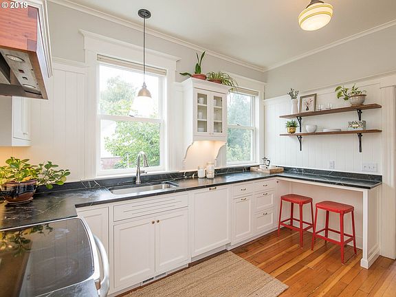 Lovingly cared for 1906 farmhouse in Hosford-Abernathy. Perched above the street on a corner lot with views of the west hills from porch and west bedroom. Main level includes fully remodeled light and bright kitchen, 1/2 bath, living room with leaded glass window, and large dining room with wainscoting & pocket doors. Unpainted original wood throughout. Upstairs includes all 3 bedrooms with large closets and full bath with clawfoot tub.