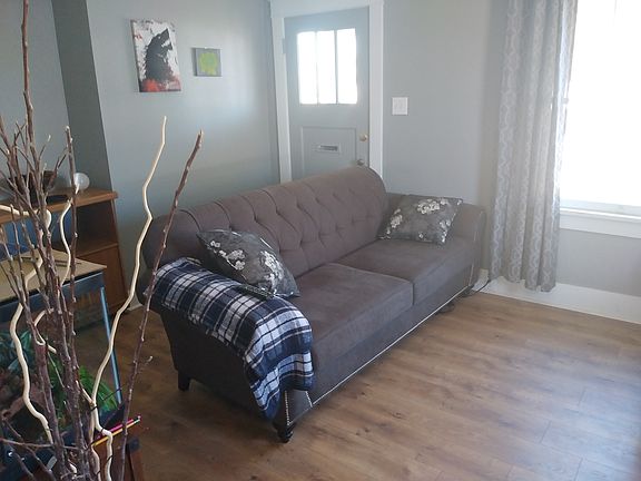 Affordable home with a detached garage. Home was renovated in 2018 when the new owner purchased it. Currently it has laminate wood flooring in the living room, brand new carpet in both bedrooms, tile in the bathroom, front mudroom, and laundry room, it also has brand new paint in all rooms. It has a floor-to-ceiling tiled shower with a rain shower head. The backyard has recently been upgraded with a permanent garden wall, pond, and water feature.
