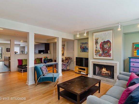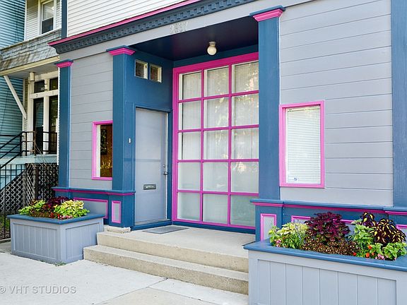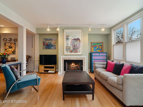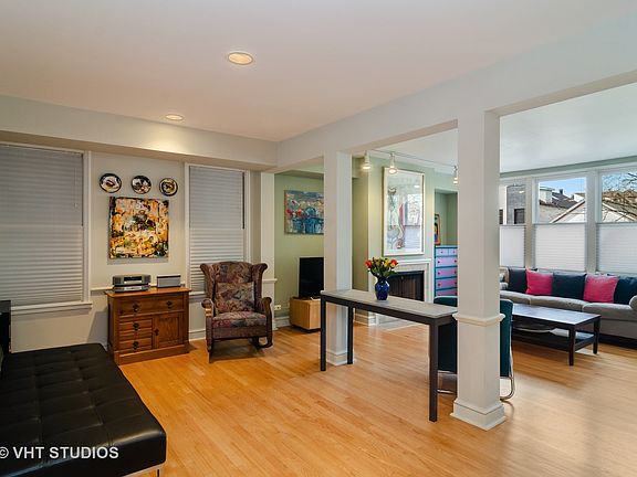 Fantastic architect-designed home with rental unit for income. Spacious owner's duplex-up lives like a house. Abundant natural light and a huge open floor plan with a true cook's kitchen. Hardwood floors throughout (slate floor in kitchen). Lovely deck overlooking yard and garden. Upstairs has three good sized bedrooms, two full baths (one in master suite) and a laundry room. There are ample closets throughout the home. First floor rental has 2 bedrooms, 1 1/2 baths and a deck -- rents easily for $2000. Utilities are all separated so tenants pay their own heat. Two car garage off alley, basement has laundry for the rental and generous storage space. Very convenient location -- walk to the brown line, grocery stores, coffee shops and restaurants. Agent owned.