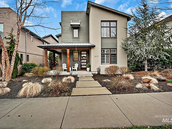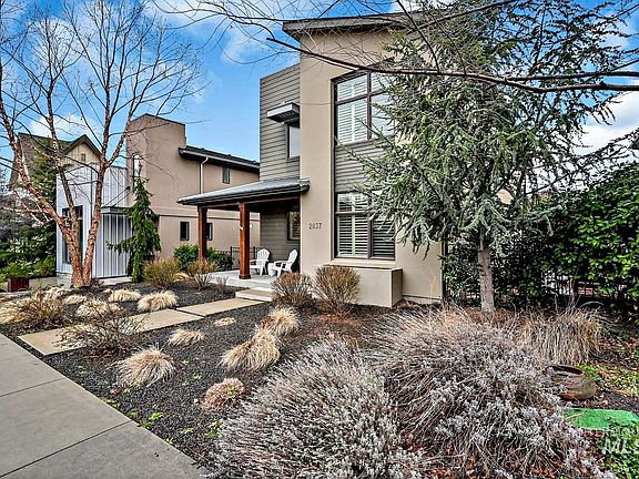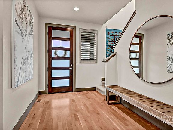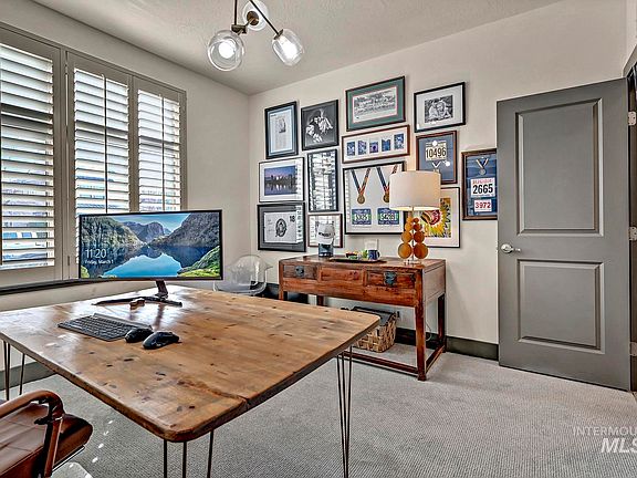 Modern design residence sits in the heart of Harris Ranch, just moments from Boise's Greenbelt, foothill trails, local dining, Bown Crossing, and Shakespeare Festival. Enjoy a spacious great room with an abundance of light and a sleek kitchen with tons of cabinets, upgraded appliances, huge pantry, granite countertops, lots of work space and an oversized island with breakfast bar seating. Hardwood floors in entry, living, dining, kitchen & halls. Most bath features tile walk in shower, floors & granite counters. Spacious primary suite features free standing tub, dual sink vanity, oversized shower with dual shower heads. Large bedrooms and tons of storage throughout! Private staircase off back leads to rec/bonus room with private bath & closet- great junior master suite! New paint floor to ceiling throughout, new kitchen backsplash, new lighting in kitchen, dining area, office & bedroom. Custom fireplace and floating shelves. Plantation shutters throughout.