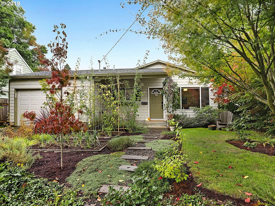 South Tabor Mid Century. Remodeled one-level with open floorplan. Flooded with light, views of established landscaping throughout. Gorgeous oak floors, wood burning fireplace, attached garage, updated kitchen & bathroom. Dining room opens to private, covered patio. Tucked away on a quiet street, a retreat-like setting w/secret sauna & shower room. Blocks from Mt Tabor, Bike routes & Division goodies. [Home Energy Score = 7. HES Report at https://rpt.greenbuildingregistry.com/hes/OR10024865]