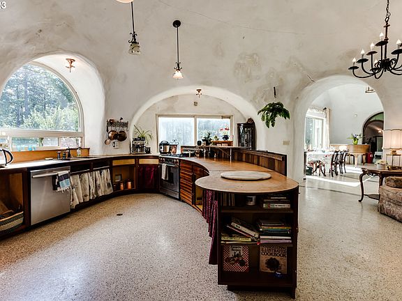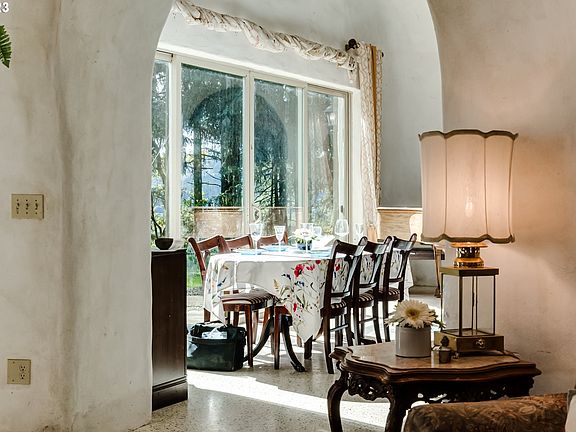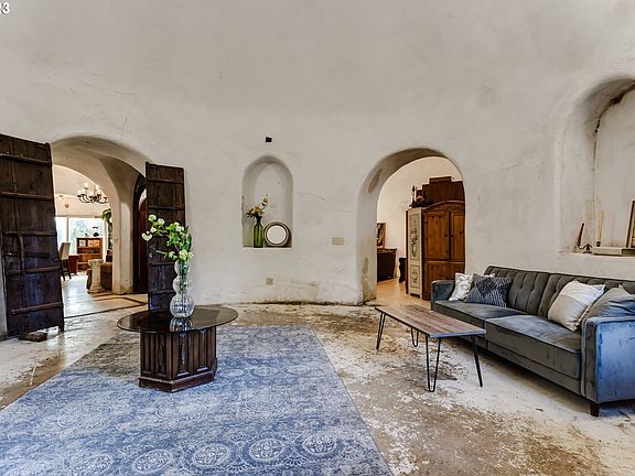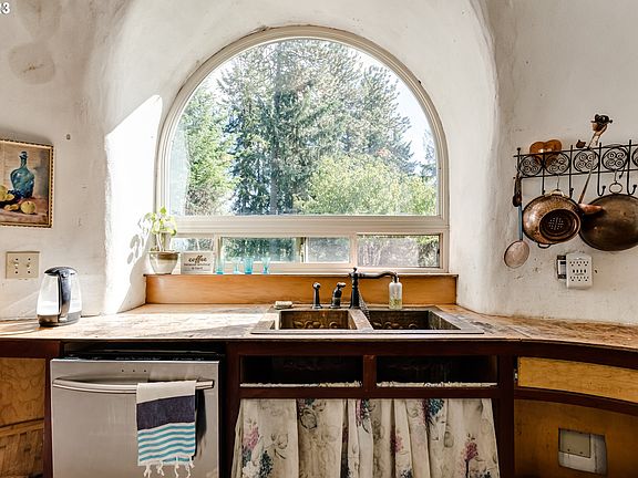 Secluded and conveniently located 15 min from Eugene. 3 bedroom 2 bath with wide arching doorways and woodwork. Sitting at the top of the hill with views looking south from east to the west, enjoy sunrises and sunsets from this rare location. This spectacular property has spacious high ceilings, custom details, terrazzo floors, radiant hydronic floor heating. Expansive arched great room enjoy light-filled, south facing sliding glass doors. 2 outbuildings one near 1000 square feet next to main house in the parking area The 2nd at south edge of property with separate entrance approximately 1200 square feet with two roll up doors an insulated metal building on a concrete slab. The experience of visiting will delight you. While soaring ceilings provide an airy and grand atmosphere to the interior, accent details, archways and doorways complete the sensation of living in a European castle. You'll surely wow your guests from the moment they arrive. Home has fiber optic gigabit speed internet service.