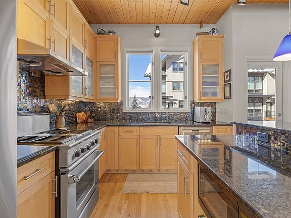 Location, location, location! This coveted Blackhawk Townhome is in the heart of the Mountain Area (allowing for short-term rentals) but feels more like a quiet neighborhood that is sheltered from the base area bustle. It is a premier winter ski spot, situated just a 6-minute walk from the slopes. If Steamboat summers are more your speed, this residence is perfect for long-term stays in the warmer months and highly rentable during ski season while you’re away. This South-facing end unit, basked in sunlight, promises elevated and urban-style living. With 3-bedroom/2.5-bathrooms and a uniquely longer floor plan than its neighbors, this residence offers a 2-car garage, a generous storage closet, and spacious living areas. The warm embrace of wood finishes is juxtaposed with modern steel and industrial accents, creating an inviting atmosphere that feels like home. The updated kitchen boasts high-end appliances, eat-in center island, granite countertops and a chic backsplash. Step outside to one of the three decks, perfect for year-round entertainment with views of the ski area. Convenience is key with a two-car tandem garage providing ample space for vehicles and mountain gear alike. With exterior maintenance, including a heated driveway and parking lot, managed by the HOA, your focus remains on living the mountain dream. Appreciate the best of both worlds with this versatile and homey Steamboat retreat.