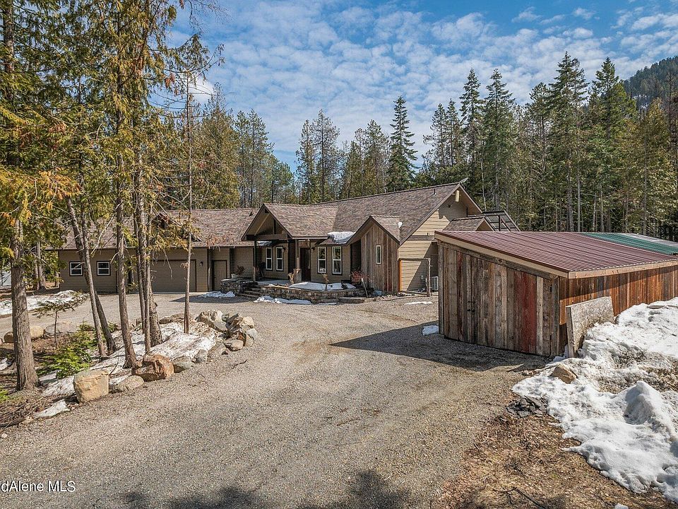 A true north Idaho dream come true! This 3 bedroom home on over 5 acres was built in 2017 and the attention to detail shines! The location makes it extra special, as it has direct access to Idaho state land for endless recreation opportunities. You'll love the added features, such as the beautiful pot belly wood stove in the cozy living room, vaulted ceiling, and custom tile in the bathrooms. Functional bonuses include whole house wired for a generator, laundry room with dog door, and 12 GPM private well. The oversized garage utilizes the 3rd bay as a wood shop and has an overhead garage door to the backyard. Plus, a dog wash! Outside, you have the convenience of a circular driveway, outbuilding with ''boathouse'', wood storage, and greenhouse with sink. 30' x 20' carport/outbuilding. Backyard has sprinkler system, orchard with 3 apple trees and peach tree, raised garden beds, inground garden beds, various berries, garlic, fenced area, and beyond your own private parked-out forest! 5 Minutes to Talache Beach on Lake Pend Orielle