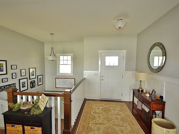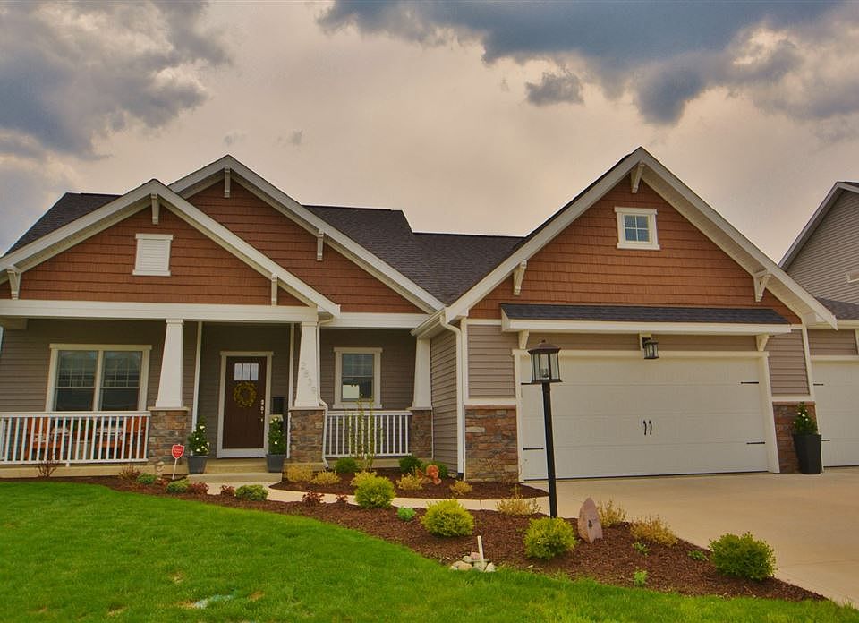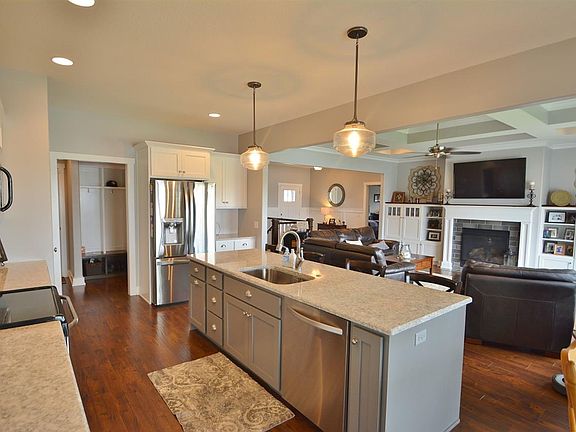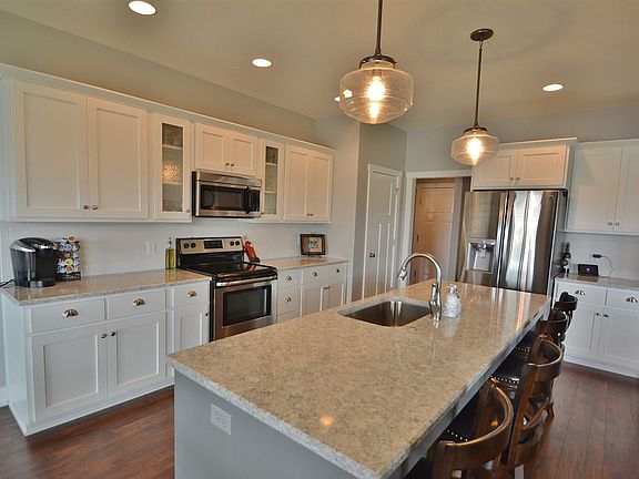 Split bedroom ranch on full finished daylight basement. 2 year old custom home with upgrades throughout. Wonderful pond views from nearly every room of the home. Large open floor plan. The great room offers a beautiful 10 foot coffered ceiling, gas fireplace and custom built in''s on each side of the fireplace, including shelving and entertainment center. There is a wall of windows overlooking the scenic waterfront lot and the floors are wood laminate. The great room is completely open to the kitchen and the kitchen has white custom cabinets with an 8 foot island. The island and counter tops are Quartz and the appliances are stainless steel. There is also a nice sized dining area off the kitchen that leads to a covered deck. The main level master suite includes a ceramic tile walk in shower with custom glass door, dual vanities and a large walk in closet. On the other end of the home are 2 additional bedrooms and a full bath. Also on the main level is the laundry room and locker area for storage and convenience. The dramatic stairway leads you to the lower level where you will find a large family room, rec room, 4th bedroom, an additional full bath and great storage. In the family room there is a wet bar area plumbed and floored and ready for the bar to be added. The views out back are beautiful and relaxing. The covered Trex deck, patio and wrought iron fence all add to the serene setting. 3 car garage, Andersen windows and so much more!