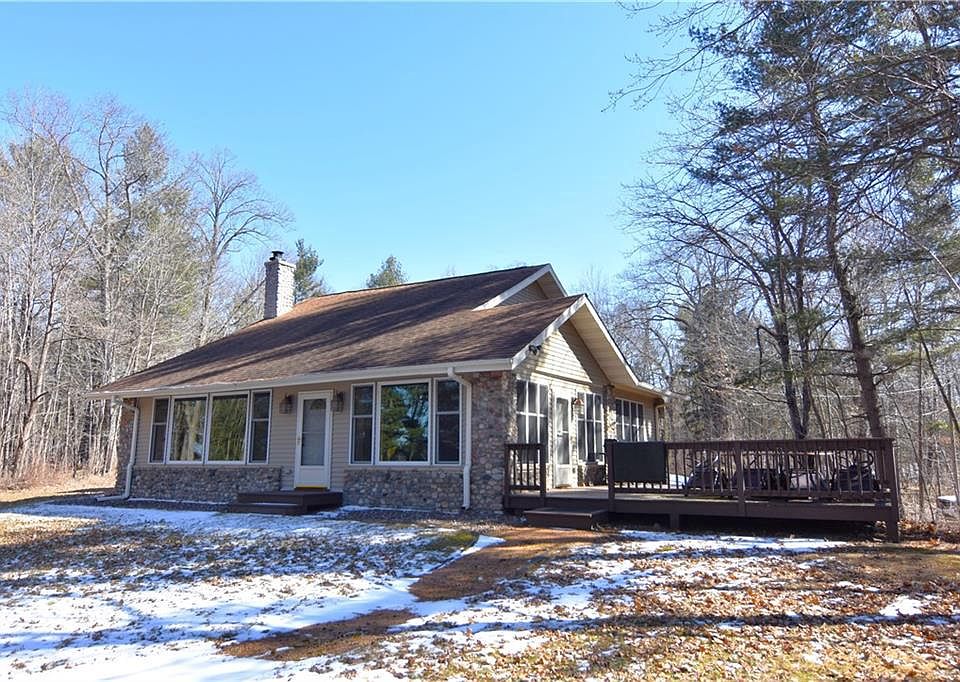 High quality lake home situated on a park like lot on gorgeous Round Lake. The beautiful 2.5 acre lot features 200 feet of sandy lakefront, with just a few easy steps down to the water. Plenty of West-facing lakeside windows provide excellent lake views, and the spacious lakeside deck is the perfect place to watch the gorgeous sunsets. The cabin features an ideal layout with main level owner's suite and laundry, with an additional 3 bedrooms upstairs for family and guests. Lakeside living area with a cozy stone fireplace, lofted ceiling, attractive kitchen and separate dining room. The huge 65x40 garage has plenty of storage for your lake toys and vehicles in addition to an insulated shop area. Round Lake is located in Chippewa County just 45 min North of Eau Claire and 2 hours East of the Twin Cities. It is a popular swimming and fishing lake, and is fully recreational. This cabin's shoreline is amazing, with a hard sandy bottom, no weeds and the depth is great for all ages to swim.