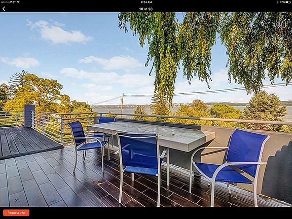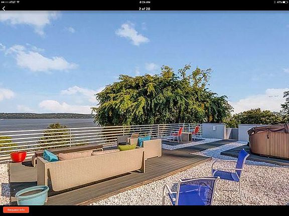 Sleek, modern, "International House". A turn key contemporary home overlooking the Hudson River and located just north of Piermont, south of Nyack and walking distance to restaurants, shops, marinas many walking/hiking/biking trails. Designed with crisp, clean lines, and utilizes limestone, large pieces of tempered glass, metal railings, marble, soapstone, cesearstone, glass tiles, and mahogany walnut flooring. Dramatic South Beach style rooftop garden overlooking Hudson with jacuzzi, outdoor tv and stone pebble flooring with industrial style railings. Many built-ins throughout. Open kitchen/greatroom concept with fireplace glass on all sides and open deck overlooking river. Kitchen features top of line appliances including Sub-Zero fridg, Fisher Paykel dishwasher wall oven, wine cooler fridge, induction cook top and more. Stone counters open to great room create "edge". NYC transportation can be hailed outside front door. Multi-level stone patios in yard. 40 min to NYC.