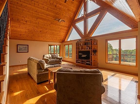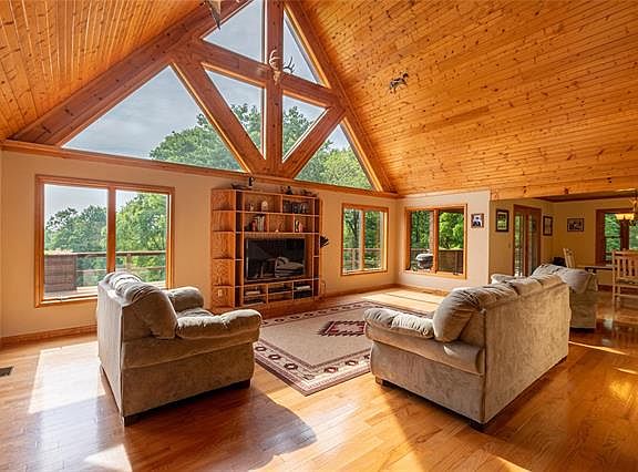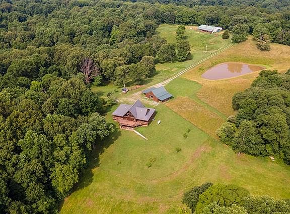 Gorgeous private custom built log home on 108.9 acres surrounded by the Shawnee National Forest. You will love the open floor plan, vaulted wood ceiling, hard wood floors and large windows for natural light. This cedar sided home has a wrap around deck to enjoy the views from all sides. The loft could be a second bedroom and the full poured basement could be easily finished. The kitchen has custom cabinets and counter and comes with all the appliances. Hardy wood burner outside. There is a 36x36 horse barn with 2 stalls, 2 lean-2s, tack room and electric. 48x75 pole building with work room, concrete floor, 12 ft ceiling, large work shop with propane furnace, office with heat and air, 1/2 bathroom on septic, 400 amp service, fully insulated with metal over insulation. 8 acres fenced with a pond. Creek runs through property with trails and bluffs.