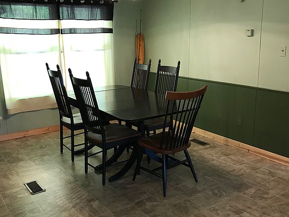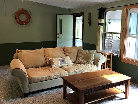 Dream lakefront getaway w/ beautiful wooded lake views. Includes 3 spacious bedrooms, 2 full baths w/ new vanities & garden tub/showers; manufactured home w/ cath ceilings, huge open living rm, dining rm, kitchen w/ pantry, enclosed lakeside 3-season room walks out to 8x30 deck, plus an 8x12 concrete patio, 15 x 24 hobby or party barn (electric and wood floored) plus covered workshop/shed/carport 24 x 54, fire pit, loads of parking for up to 15 vehicles, private lakefront dock, spread out over 4 private acres w/ gated, winding gravel drive . Aprx 40 steps to waterfront, dock is across the dead end road. Ideal for personal entertaining or incredible rental. The ''dock'' there is a licensed and modified deck boat - titles and is included - but sellers also have a legit dock permit to put on