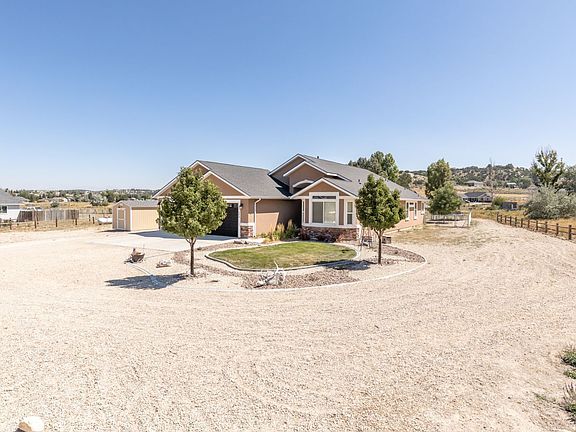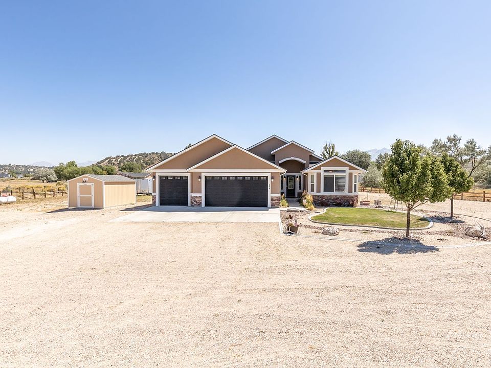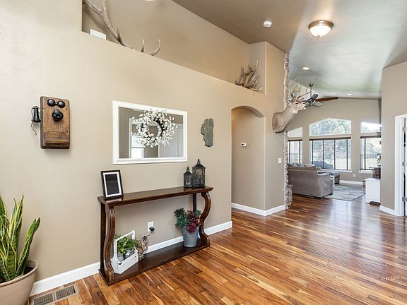 Nestled in a serene neighborhood near schools, shopping and other amenities, this 4-bed, 2-bath haven blends rustic charm with modern living. Acacia wood floors lead to a captivating rock fireplace with a pellet stove insert, setting the stage for cozy autumn evenings. The kitchen boasts wood cabinets, granite countertops, a subway tile backsplash, stainless-steel appliances, (including a brand new natural gas range to be installed), appealing to culinary enthusiasts. Immerse in entertainment in the living area with surround sound, bask in natural light beaming through grand windows, all accentuated by vaulted ceilings. The spacious master bedroom offers private patio access and an ensuite with a jetted tub, walk in cultured marble shower and separate vanities for luxurious relaxation. Other highlights include a brand new central A/C, new water heater, large laundry room, stucco exterior and a shed for extra storage space. The 3 car garage is fully insulated, finished with tape, texture, and paint! The garage doors are also upgraded and insulated! This home is being converted to natural gas to cut out propane costs! Schedule your private showing - make this beauty your home, today!