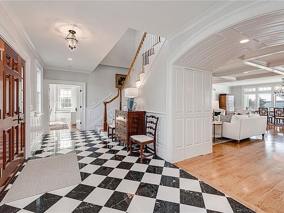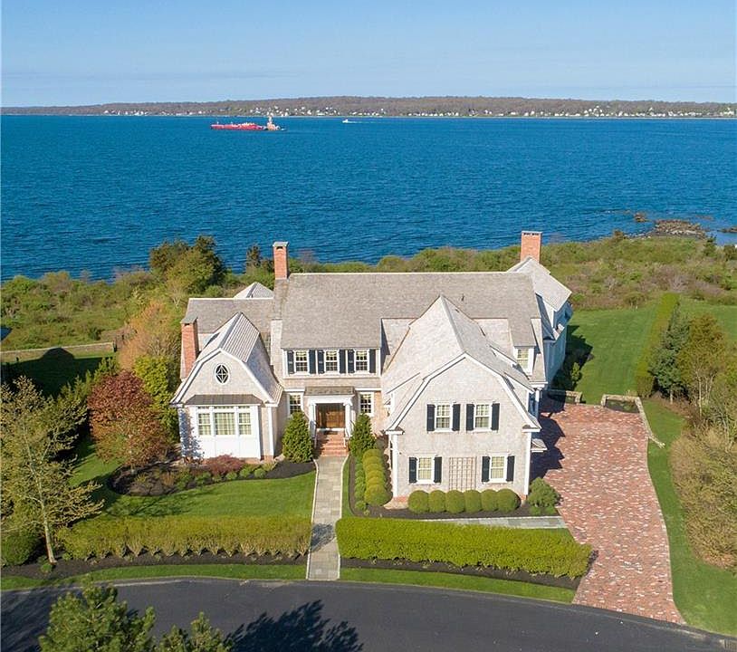Exquisite waterfront shingle-style home with expansive westerly & southerly views of Narragansett Bay from virtually all rooms. Offering 3 floors of gracious living, this residence benefits from superb millwork, extensive wainscoting, coffered ceilings, built-in cabinetry & beautiful maple hardwood floors. The great room features a striking fireplace, coffered ceiling & a large dining area with a wall of windows offering sparkling water views. The library has an illuminated Tiffany stained glass panel over the fireplace. The recently updated gourmet eat-in kitchen offers high-end appliances, quartz countertops, custom cabinetry, 2 large islands, wine refrigerator & bar stool seating. The den is casual yet refined with a newly added bar area, exposed beam ceiling & fireplace which leads to a 3 season porch with fireplace. The kitchen, den & porch all benefit from water views. The gracious 1st floor master suite features a Palladian window overlooking the bay. The master bathroom has a large shower, sumptuous soaking tub, double sinks, 2 WC’s & spacious walk-in closets. There are 4 large en-suite bedrooms on the 2nd floor with most benefiting from water views. The walk-out lower level provides ample space for a pool table, bar, media room, gym, full bathroom, storage & utilities. Set on 1.7 acres within a private gated estate, the buyer may choose to join the Aquidneck Club to enjoy its golf course, tennis courts, marina, restaurant & equestrian facilities.