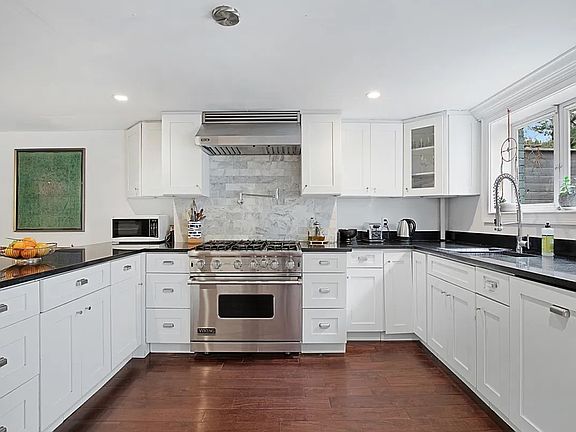 Towards the rear of the garden level is a large chef's kitchen equipped with luxury appliances including a Viking six-burner gas stove with commercial-grade hood, Viking 36" built-in fridge, Asko built-in dishwasher, and a pot filler faucet in addition to the kitchen sink. There is ample space for multiple people to prepare meals at the same time. The clean white cabinets, black granite countertops, and Carrera stone tiled backsplash create a timeless look. Adjacent to the kitchen is an elegant powder room.