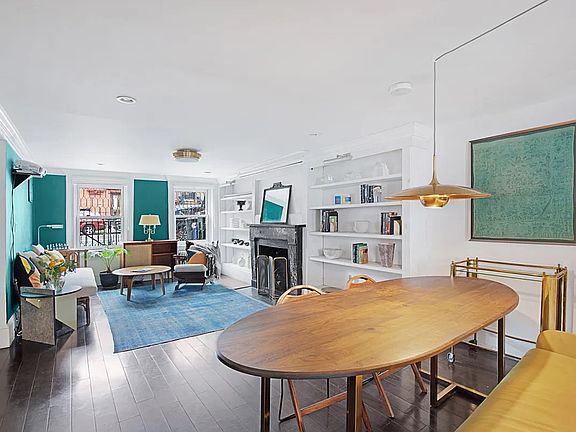 Entering through your private entrance, the first floor features a wide, open-plan living area with Brazilian Ebony Teak hardwood floors, 2 large windows and custom-built bookshelves surrounding a decorative marble fireplace. The living area is perfectly proportioned as a generous sitting area surrounding the fireplace, and a separate dining area with space to host dinner parties as well as casual weeknight meals.