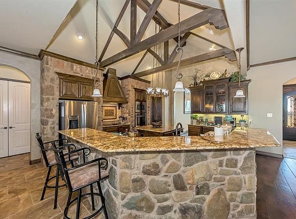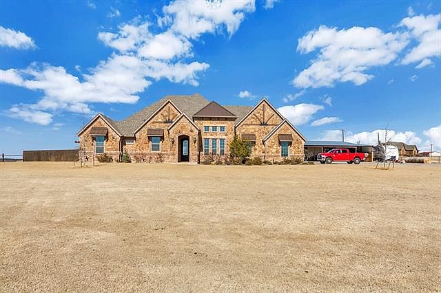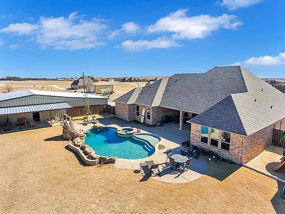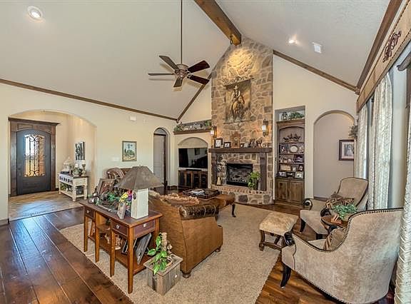 This home is a show place! Custom ranch featuring 4 bedrooms, 3 full baths and one-half bath off over-sized game room. Open beams, vaulted ceilings, beautiful floor to ceiling rock fireplace in LR, custom cabinets, amazing granite throughout, hand scraped wood floors, tankless water heater, stunning master retreat with remote electric fireplace in master bath, heated pool features glow in the dark tile, spa and water features. 30 X 50 insulated shop with electric, plumbed for bathroom, and 20 X 50 carport together with 10 X 30 covered porch. All on approx. 6 acres wtih pipe fencing. Flawless detailed workmanship! Exceptionally low utility costs.