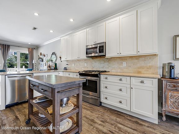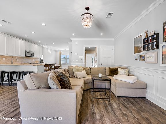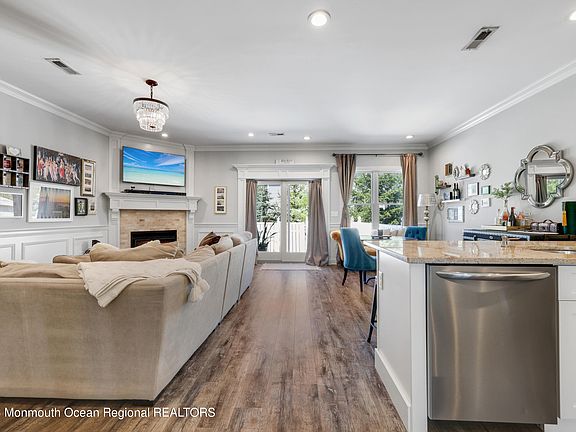 This 3 bedroom, 2.5 bathroom townhome is located on the swimming river (just steps away) in Red Bank's up and coming West Side. This home is filled with modern luxury touches throughout, including crown molding. The main floor has 9 ft ceilings, an open living space, a gas fireplace, picture moldings and an abundance of natural light from the large Anderson windows. The kitchen sits in the middle of this floor and boasts a timeless design, stainless steel appliances, and a pantry. Enjoy meals at the casual breakfast bar, or in the formal dining space. The top floor hosts three bedrooms and a conveniently located laundry area. The primary suite has an oversized WIC and a private spa like ensuite bathroom. Relax outside on your fenced in paver patio. Easy access to the train and downtown.