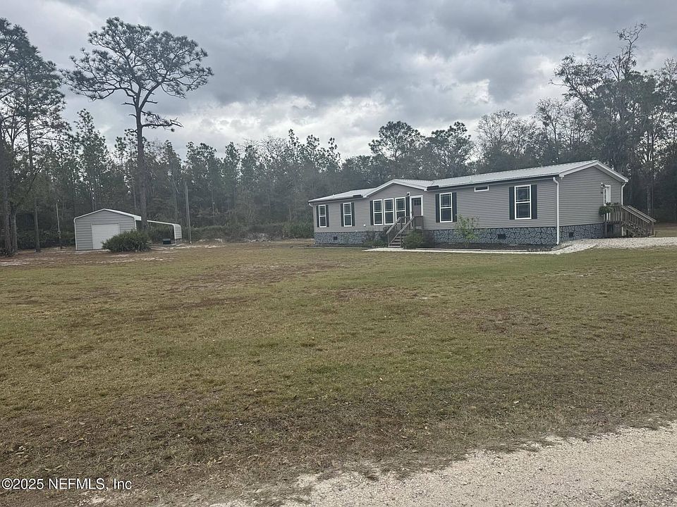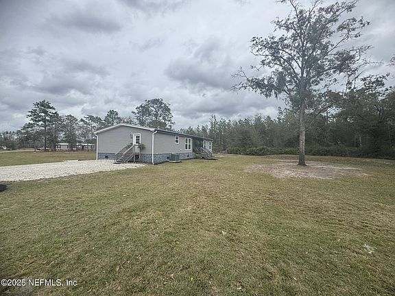 Experience the charm of country living with this beautiful farmhouse-style manufactured home with timeless details and inviting finishes on 5.08 acres of scenic countryside. This home was custom ordered in 2021 with above average upgrades including sleek recessed can lighting throughout, luxurious oversized walk-in tile shower, spacious and open concept layout for relaxed living. Detached garage/workshop for projects, storage or hobbies. Deep well providing reliable, high quality water supply. Two separately fenced pastures (each over an acre) ideal for livestock or horses. Automatic electric entrance gate for added security and convenience. All this on peaceful surroundings with roosters crowing and deer roaming. This property is a dream for anyone seeking country farmhouse charm with modern features and functional land use