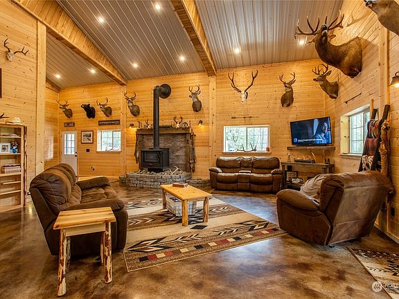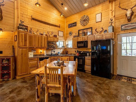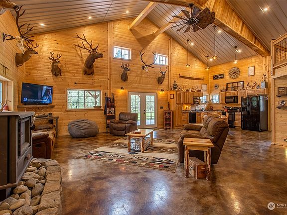 Right out of a FIELD & STREAM magazine! Find warmth in this cozy cabin feel on just under 10 acres just outside of city limits. This place has it all from vaulted ceilings, open concept, meandering creek & 36x36 shop. Glossy, stained, heated concrete floors are pet & dirt proof. Pine wood finishes throughout w/ that rustic touch. Sit around the crackling wood stove & exaggerate hunting stories. Primary suit with bathroom access & large walk-in closet. Office/den can be used as sleeping arrangement if needed. Unfinished loft is plumbed for 3 beds/1 bath or let your bonus room ideas run wild with that blank canvas. The shop has a walk-in cooler for the avid sportsman. Watch the salmon migrate up the creek & enjoy that outdoorsman lifestyle!