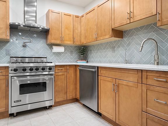 Inside, the home boasts an open and airy layout with front bay windows overlooking a picturesque townhouse-lined street. Gleaming hardwood floors, recessed lighting, and a sophisticated design create a warm and inviting atmosphere. The large, open kitchen is a chef’s dream, featuring a stainless steel Viking range with a vented hood, a convenient pot filler, quartz countertops, a custom tile backsplash, and a water filtration system.