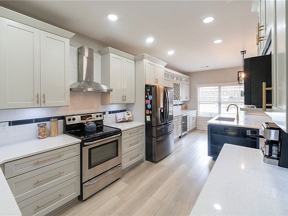 - Description: Gray 42 inch Cabinets and quartz island, Stainless Steel Appliances,Flooring: Plank,Simulated Wood