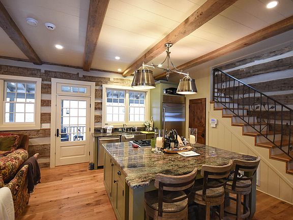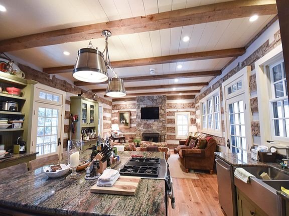 Perched on Greenbrier Mountain, two antique log structures are framed by extensive, wrap-around porches. The porches that connect the homes feature an outdoor fireplace and outdoor dining overlooking the stream below. With the sound of a trickling stream in the background, guests will find relaxation in the mountain air. The second level master bedroom has a view of the treetops, simulating an elevated treehouse experience. Reclaimed beams, stone fireplaces, and slate tiled bathrooms complement the cabin exterior. This luxurious getaway is finished with custom iron railing and fixtures. Granite counters, oak hardwood floors, and gourmet appliances contrast the rustic surroundings creating an elegant retreat.
