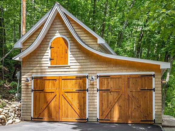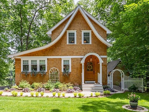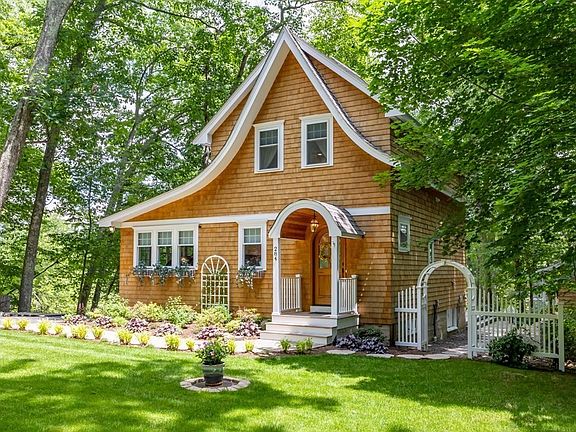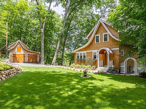 Welcome to Storybook Cottage, a custom home nestled in an idyllic setting offering a beautifully landscaped yard. Stone walls, perennial gardens, and a hardscaped patio overlook the private dock and 175 ft of water frontage on Duck Pond. Step through the arched doorway to find a nicely appointed kitchen with granite counters and SS appliances, a living area with a cozy gas fireplace, and a half bath. The family room wrap-around windows offer loads of natural light, showcasing the custom-built wall unit. Hardwood flooring runs through the main level and custom lighting can be found throughout the home. Two bedrooms and a custom full bath are located upstairs, along with the laundry. A separate home office and loft space provide a peaceful place to work from home while overlooking the pond. The 2-car garage features automatic doors that swing outward and additional storage. Every space has been thoughtfully engineered by the current owners, with ample storage and attention to detail.