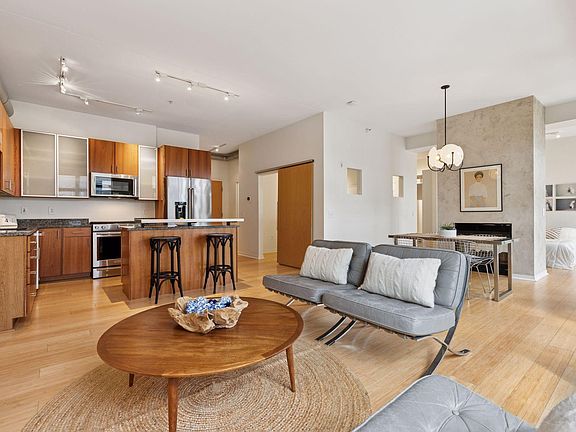 Experience modern urban living in this light and bright east-facing home at the award-winning Midtown Lofts, perfectly situated in the heart of Uptown. This stunning unit is within an easy walk to lakes, parks, restaurants, shopping, and public transportation, offering unmatched convenience and vibrant city living. The expansive wall of oversized windows fills the space with natural light, accentuating the impressive 10-foot ceilings that make the home feel even larger and more open. The center island kitchen features granite countertops, stainless steel appliances, and ample prep space, perfect for entertaining or everyday living. The living area is highlighted by a two-sided gas fireplace, providing warmth and ambiance to both the public and private spaces. The versatile second bedroom is currently used as an office but could easily function as a den or family room. Midtown Lofts also offer an array of exceptional amenities, including a car-wash station, bike racks, a dog run, a center courtyard, and a community garden. The development’s solar panels emphasize its eco-friendly approach, promoting sustainability and energy efficiency. Adding to its appeal, this unit comes with two (rare) underground heated parking spots in an ideal location (#31 and #32). Experience luxury, sustainability, and the best of the city at Midtown Lofts. Great homeowners association. **NOTE: THIS HOME COMES WITH TWO PARKING SPACES**