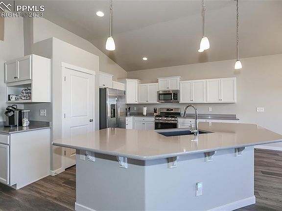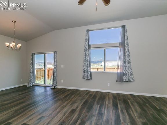 Move in Ready new ranch home! Upgraded with all the modern luxuries this is a must see. Located in The Sands neighborhood with easy access to Peterson & Schriever AFB, schools, shopping, entertainment, & main roads. All main level living efficient design with no stairs. As you enter luxury 5” vinyl plank wood floors greet you and flow throughout the great room, dining & kitchen. The light & bright great room is the perfect space to entertain or relax. Boasting views of Pikes Peak & the Front Range, vaulted ceilings, energy efficient vinyl windows, walk-out access & opens to the gourmet kitchen. The kitchen features breakfast bar, large quartz island & counter tops, stainless steel gas range/oven, dishwasher, microwave & refrigerator. Coffee or wine bar also built in. Master bedroom boasts mountain views, walk-in closet & adjoining 5pc bath w/tile floor double vanities w quartz & soaking tub. The additional 2 main level bedrooms have easy access to hallway full bath also boasting quartz counters & tile shower surround. Additional highlights include central A/C, main level laundry, insulated garage walls/attic & more. This home is surrounded by all the modern conveniences.
