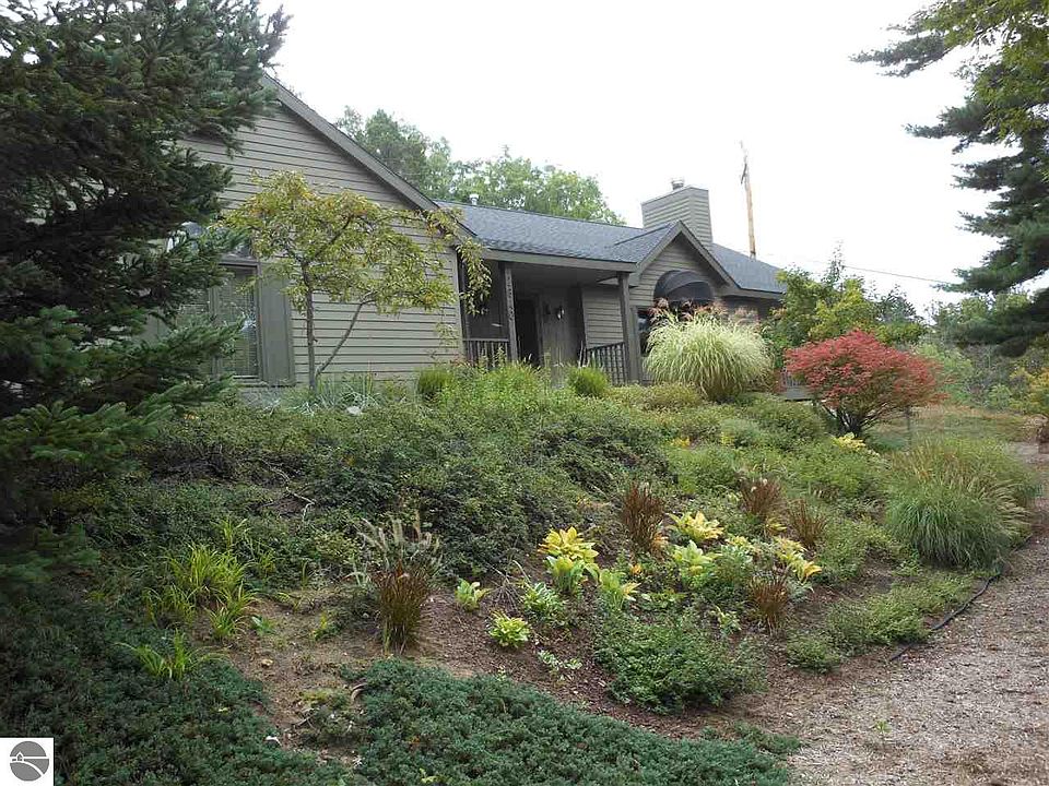 Popular Holiday Hills-quality Ranch home with traditional touches! LIVING ROOM invites you to view the beautiful architectural features in the cathedral ceilings and cultured Fieldstone natural fireplace; spacious main floor MASTER SUITE for privacy and leisure time; DEN with French doors (11.06x10.02); GOURMET KITCHEN with Island and stainless appliances; Oak hardwood floors; main floor laundry; walkout lower level has FAMILY ROOM with walk out to patio; 2 BEDROOMS with egress windows; full bathroom; private entrance from garage to lower level. Situated on a double lot with underground irrigation; enjoy the Upper Deck with East GT Bay views; beautiful landscaping & perennials. Sellers reserving 2 mirrors in 1/2 bathroom. Close to TART Trail, VASA, East GT Bay Parks and waterfront, Mt Holiday Skiing and Traverse City!