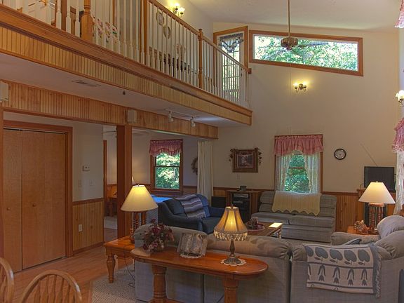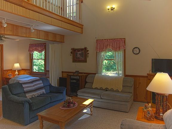 The great room, with its cathedral ceiling and multitude of windows, bathes the space in natural light. It features a large sectional sofa, sleeper sofa, love seat, and a cozy corner twin bed, perfect for snuggling up on movie nights or lounging with a good book.