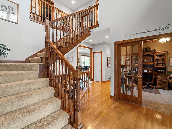 Welcome to this meticulously maintained home in the desirable Legacy neighborhood features a charming wrap-around porch, inviting you to enjoy peaceful outdoor living. Step inside through the grand entrance, where you'll find a home that has been beautifully updated with a new roof, furnace, AC, all-new windows, and modern appliances, all within the last few years. The craftsmanship is evident in the stunning woodwork throughout bringing charm into every room. Additional highlights include a dedicated office space and a walkout finished basement with an open room and bar area, perfect for entertaining or relaxing. A true blend of timeless charm and modern conveniences!