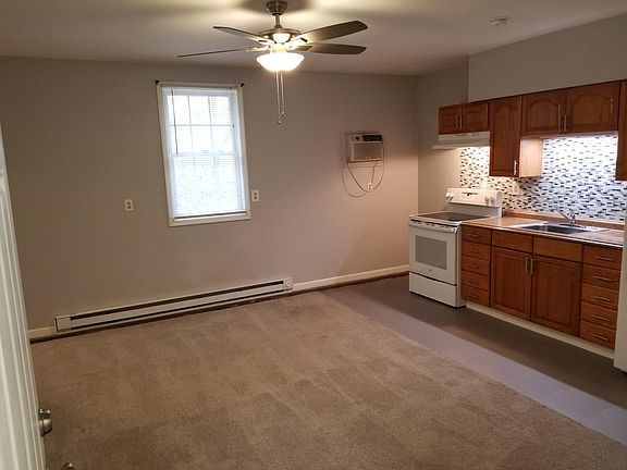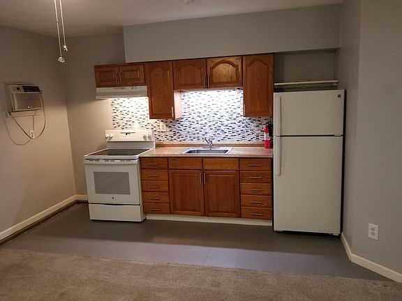 Garage apartment with carpeted living room/dining room/kitchen combo on first floor and 2 bedrooms and bath upstairs. Plenty of closets/storage! Utilities included: electric water cable tv and internet. No laundry on premises but at least two laundromats within a half mile. Electric heat/cooling, cable tv and internet included in utilities.